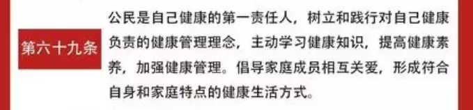 值得一提的是“倡導健康生活方式、倡導健康飲食習慣、加強健康管理……”等內容被寫入法律。《健康法》第六十九條:公民是自己健康的第一責任人,樹立和踐行對自己健康負責的健康管理理念,主動學習健康知識,提高健康素養(yǎng),加強健康管理。倡導家庭成員相互關愛,形成符合自身和家庭特點的健康生活方式。